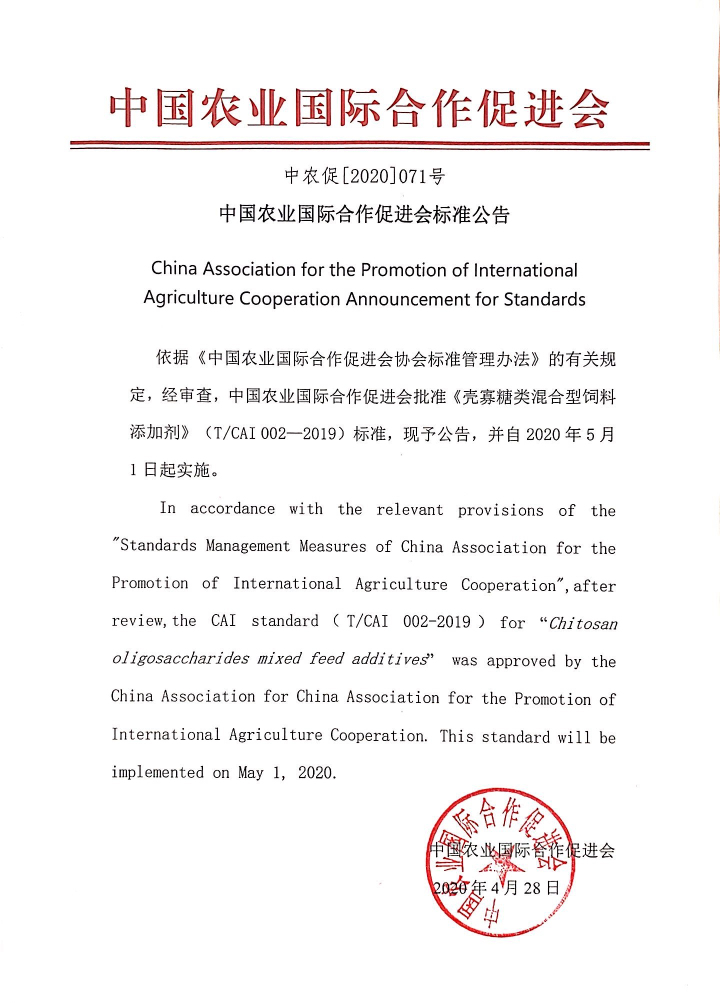 經過將近一年的準備和各位專家的認真審閱與修改,由中國農業合作促進會發起,山東衛康生物醫藥科技有限公司聯合殼寡糖行業的多家企業及中國科學院海洋研究所、中國海洋大學醫藥學院、中國科學院煙臺海岸帶研究所、哈爾濱工業大學、青島農業大學等科研院校共同制定的《殼寡糖類混合型飼料添加劑》(T/CAI 002-2019)標準于2020年5月1日起正式開始實施。